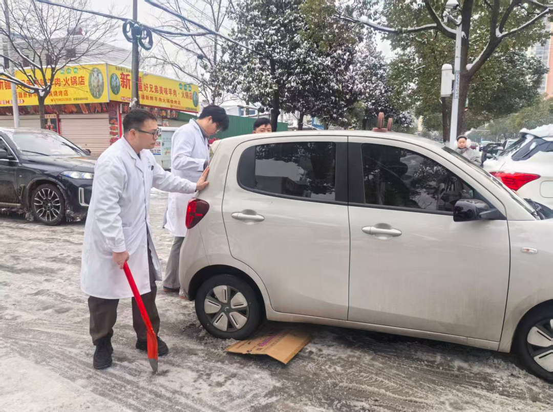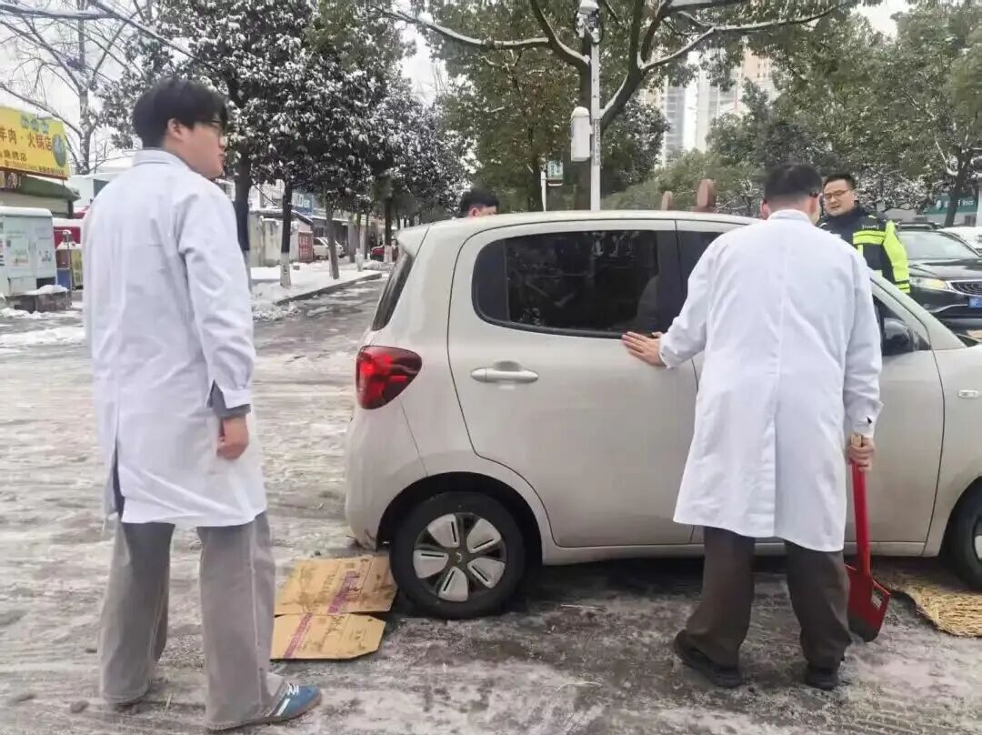 看到这一幕,几位医护人员没有丝毫犹豫,立刻上前帮忙。他们有人从附近找来纸板、草垫垫在车轮下增加摩擦力,有人拿起铁锹清理车轮下的积雪和碎冰,还有人合力推车,大家分工协作,忙得不亦乐乎。
